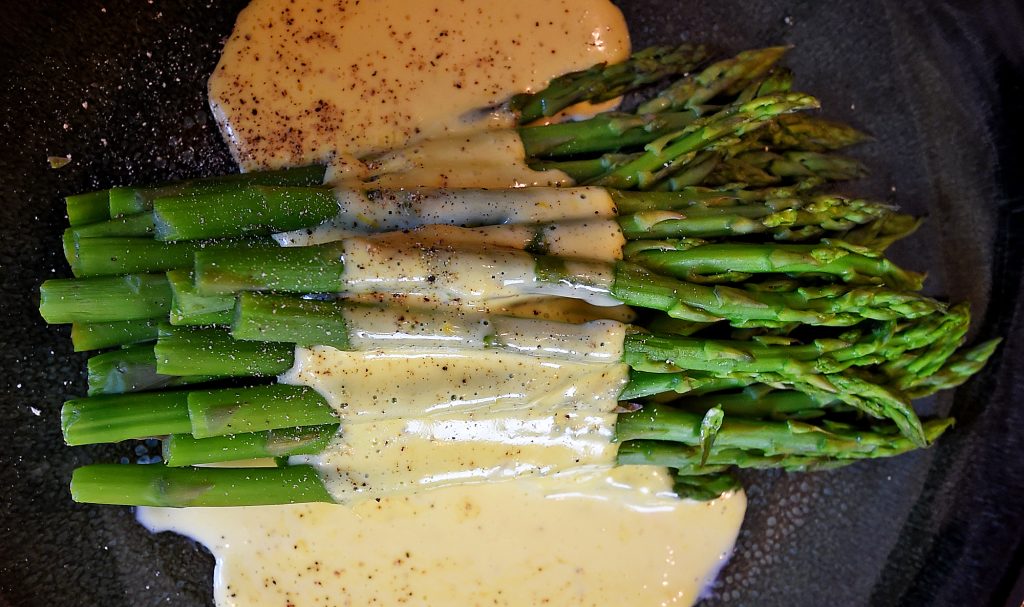 Place asparagus on a serving platter. Season with salt. Drizzle warm hollandaise over top. Garnish with freshly cracked black pepper.