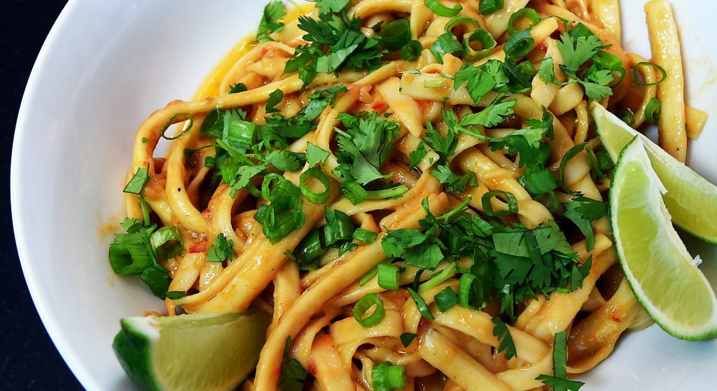 Toss in noodles until evenly coated. Thin sauce as needed using the reserved noodle liquid.