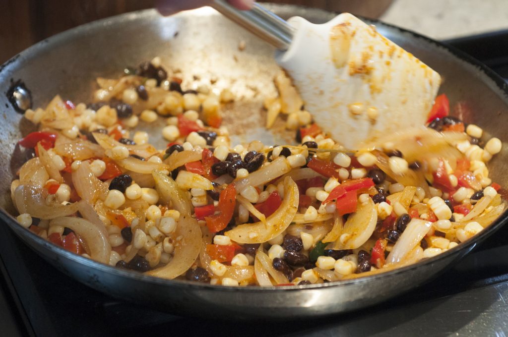 Seasonal corn off the cob, creamy black beans, sweet red peppers, sugary Vidalia onions, all sautéed, concentrating a tender, earthy sweetness wrapped around milky, tender crisp corn.