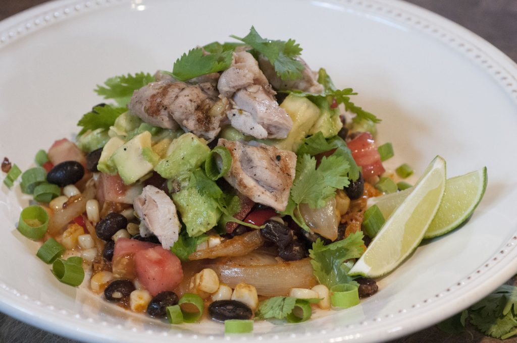 Then they’re layered with bursts of fresh cilantro and thinly sliced green onions on top of plump, juicy tomatoes bursting with bright lime juice, then finished with succulent, bite-size chicken thighs and perfectly diced creamy avocado.