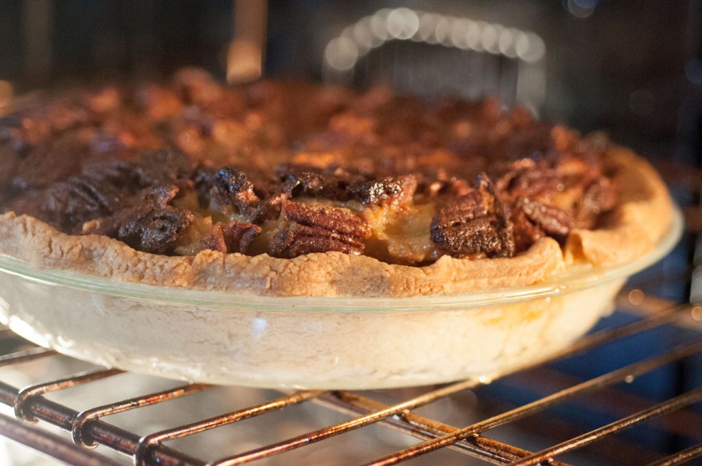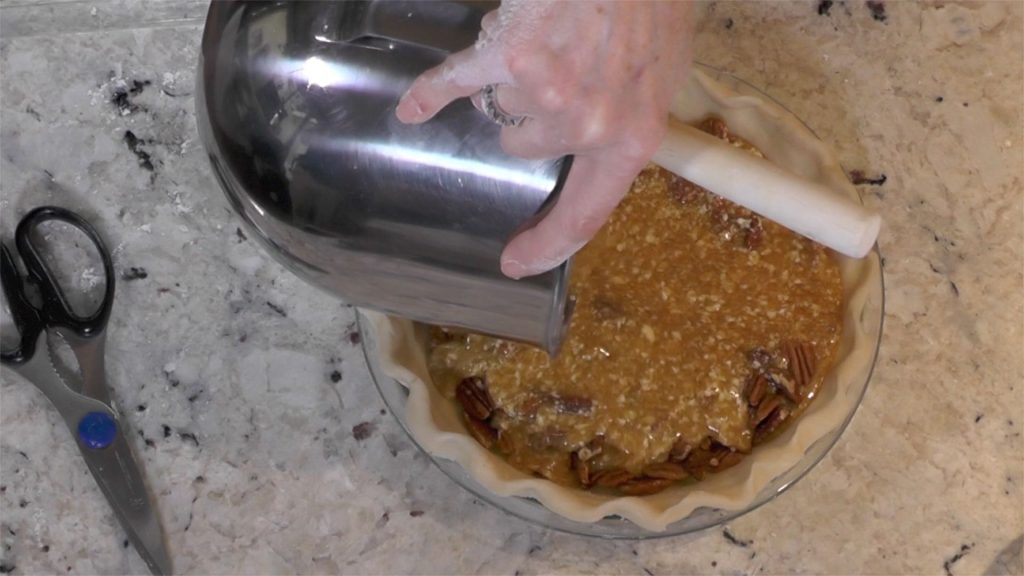 Place pecans over the bottom of the pie dough. Pour filling mixture over the pecans.