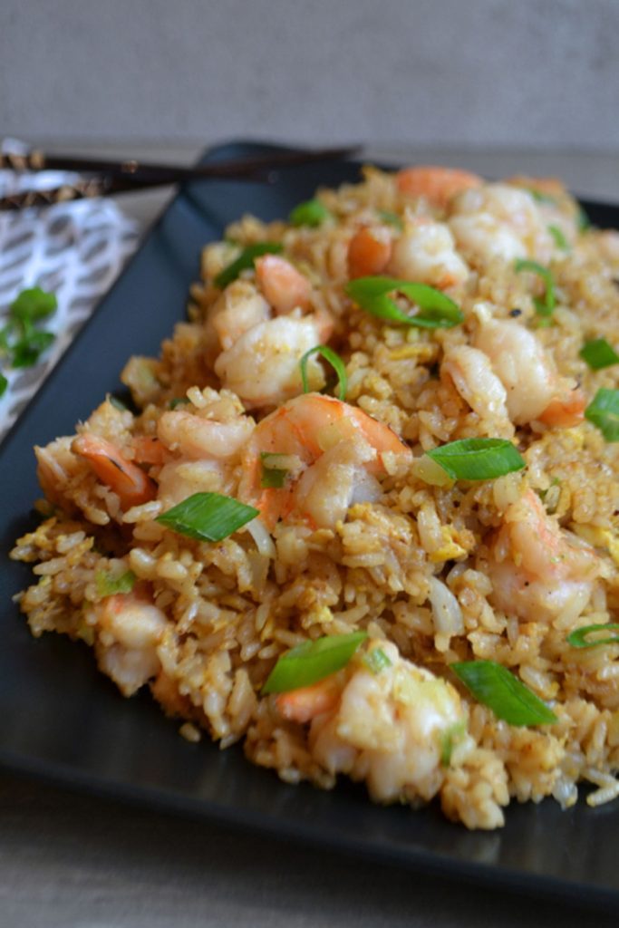 Return the onions, garlic and shrimp and stir-fry to evenly coat with the rice, 30 seconds to 1 minute.