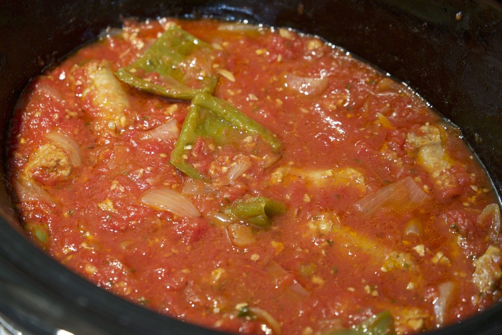 Add green peppers and onions into the slow cooker and nestle the thyme bundle under the sauce. Gently stir.