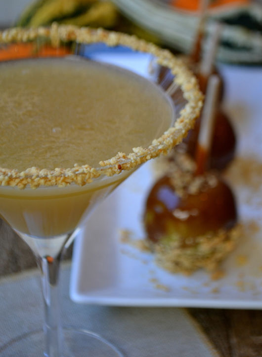 Fill cocktail shaker with ice and add half of the caramel apple martini mixture. Shake vigorously for 30 seconds and pour among two prepared martini glasses. Repeat second batch.