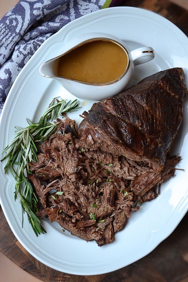 I suppose you could prepare this roast in a slow cooker, but you’ll never get the same browning as roasting in the oven. Instead of searing the meat first, after 3 to 4 hours at a high temperature, the top of the roast naturally sears and browns (even while covered), caramelizing the meat, creating a depth of rich flavor that only the oven can do.