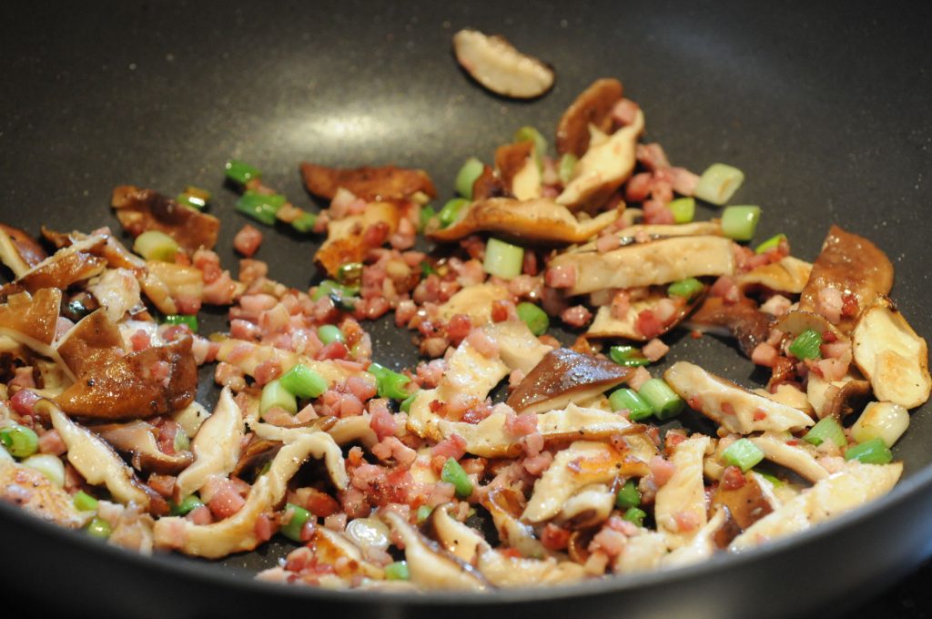 Heat 2 tablespoons oil in a wok or 12-inch nonstick frying pan over medium-high heat. When the oil is heated, add pancetta and sauté until lightly browned, about 2 minutes. Add the mushrooms and the white parts of the green onions. Season with ½ teaspoon salt and ¼ teaspoon pepper.