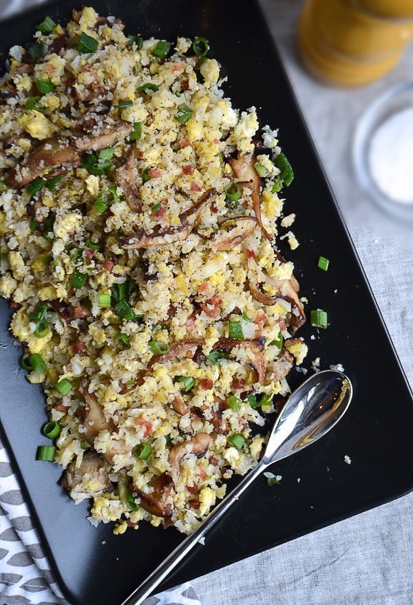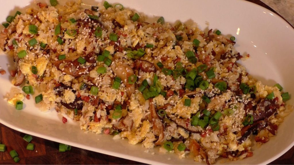 I call my simple creation to start your day Stir-fry Cauliflower Breakfast Rice. Stir-fry for breakfast? Why not? I add a deconstructed omelette, using shiitake mushrooms, pancetta (Italian bacon) and eggs to the stir-fry for a delicious new twist.