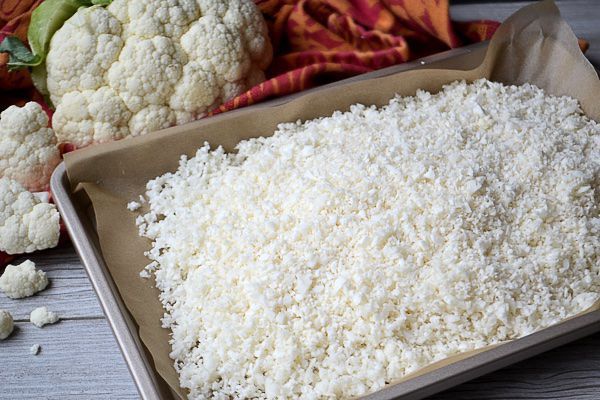 Trim the cauliflower into florets and place into a food processor fitted with the steel blade attachment. Puree until finely chopped, resembling rice (this happens quickly).