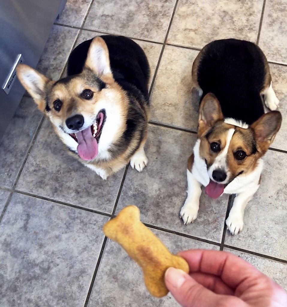 Now, Margo and Todd are not especially picky when it comes to snacks, but nothing gets their fluffy little rumps into sit-stays quicker than when the lure contains a too-irresistible-to-a-corgi ingredient: peanut butter or pumpkin.