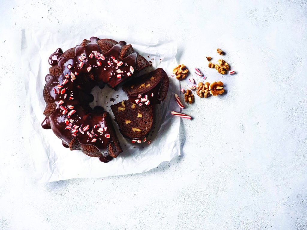 Drizzled with a chocolate-peppermint glaze and finished with walnuts and crushed peppermint candies, a Walnut Chocolate Peppermint Bundt Cake can provide the perfect finish to the festivities. The soft cake and crunchy walnuts contrast for an ultimate texture combination.