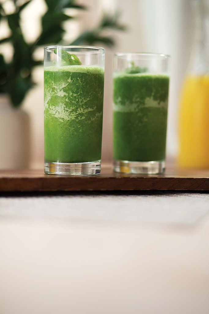In large blender, blend 100% orange juice, frozen pineapple, kale and mint leaves until smooth.