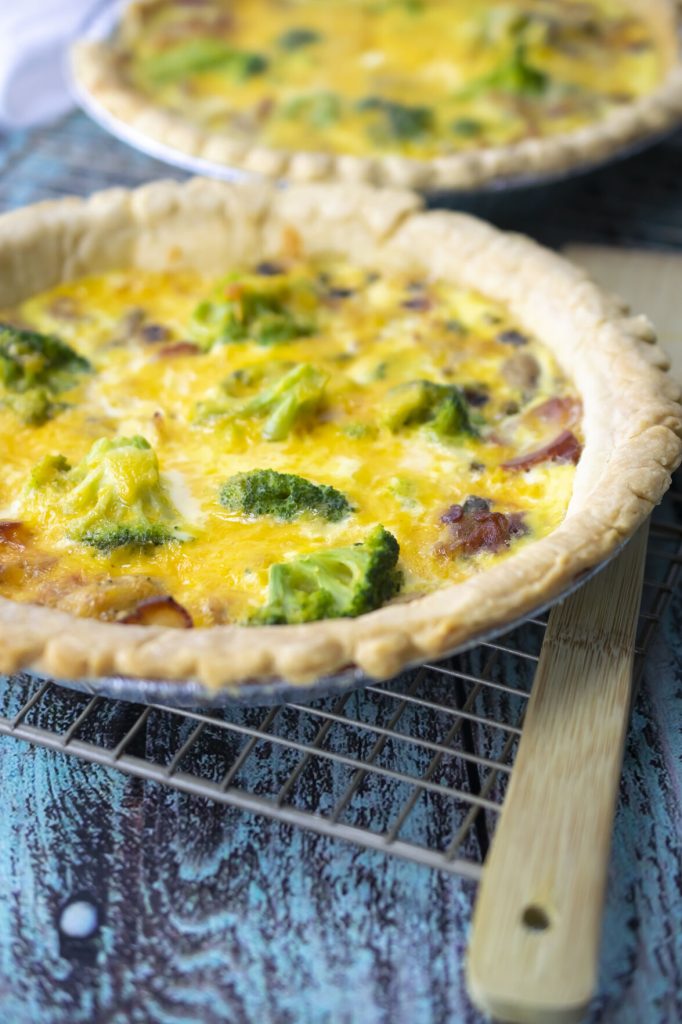 In two separate pie shells, spoon in the bacon mixture then pour the egg and broccoli mixtures over the top. Sprinkle with a little more cheese then bake for 35-45 minutes at 350 F.