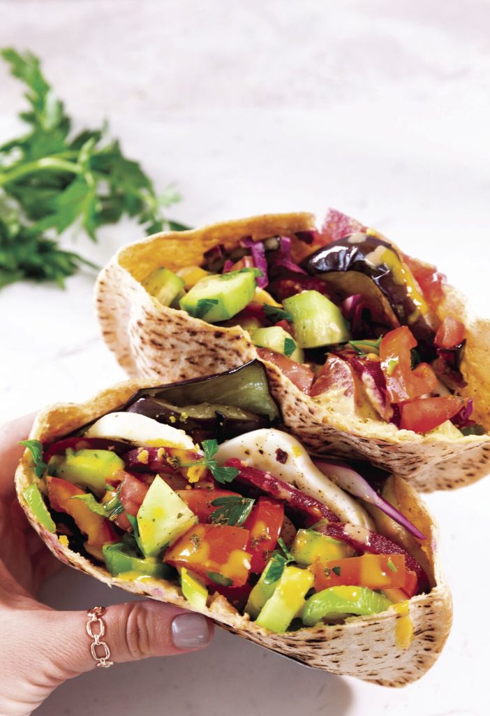 Gently slice one end of each pita and open pocket. In microwave on high, heat pitas 10 seconds. Place equal amounts fried eggplant in each pita. Spread 2 tablespoons hummus in each pita. Gently layer one-fourth of egg slices, beets and onions, cabbage, Israeli salad and green peppers in each pita.