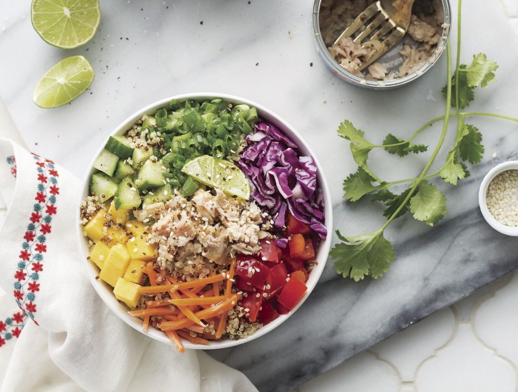 Divide cooked quinoa between four bowls. Top each with evenly divided tuna, cabbage, cucumber, carrots, red peppers, mango and green onions.