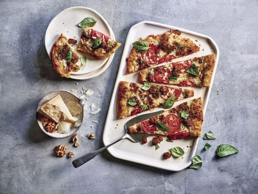 Spread remaining dough pieces with pesto, remaining cheese, remaining Walnut Sausage Crumble and tomatoes.