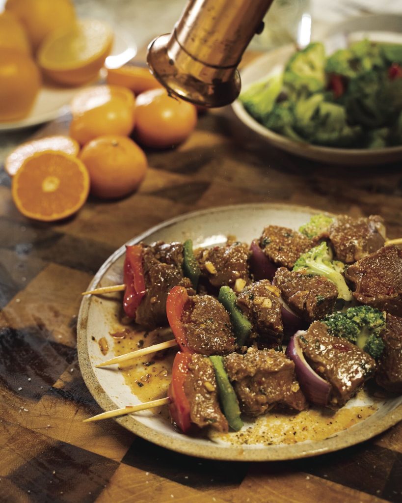 Using long skewers, build kebabs, alternating beef, peppers, onions and broccoli on each.