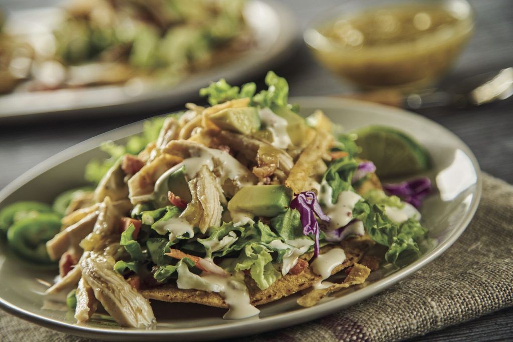 These easy Kickin’ Chicken Tostadas are made using the Kickin’ Bacon Ranch Chopped Kit, which includes garden fresh cabbage, green leaf lettuces, carrots, green onions, tortilla strips, uncured bacon bits and some heat from jalapeno ranch dressing. Just add the mixture to tostada shells topped with salsa verde chicken and avocado for a flavorful combination.