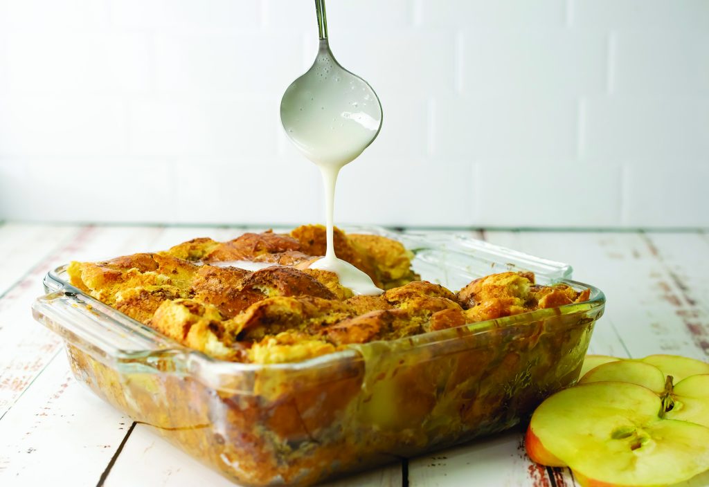In baking dish, add 10 ounces cubed French bread in bottom of dish. Pour apple filling over bread. Top with remaining cubed French bread. Set aside.