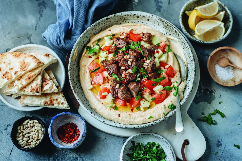 To serve, place cucumbers and tomatoes in well of hummus then top with lamb, pine nuts and parsley.