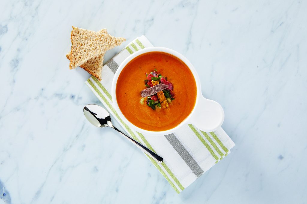 For a fiery, zesty twist, this Red Pepper Chickpea Soup with Gazpacho Relish and Tortilla Croutons calls for Fresh Cravings Hummus, as its ideal creamy texture and savory taste balances out the spice. Made with a short list of high-quality ingredients like chickpeas, tahini and Chilean extra-virgin olive oil, this hummus has a smooth, creamy mouthfeel.