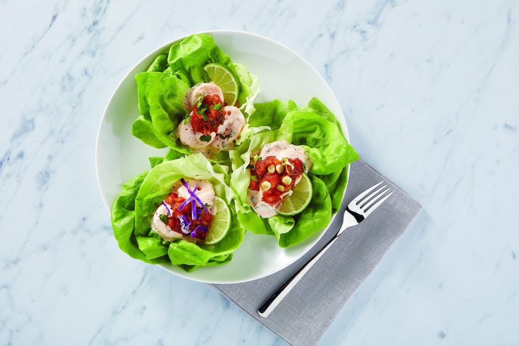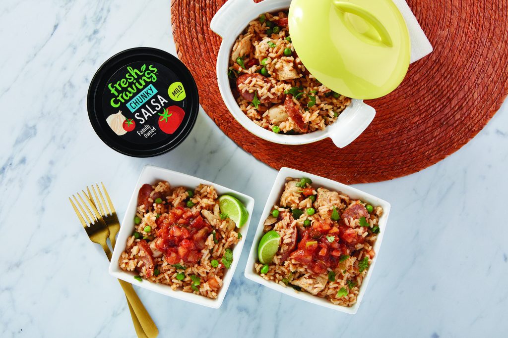 This menu from “The New York Times” bestselling cookbook author and recipe developer Stephanie Banyas offers delightful flavor fusions from around the world. The lively tastes of the Spicy Shrimp Remoulade in Lettuce Leaves and Mexican Style Paella with Chicken and Sausage pop with the high-quality ingredients of Fresh Cravings Salsas.
