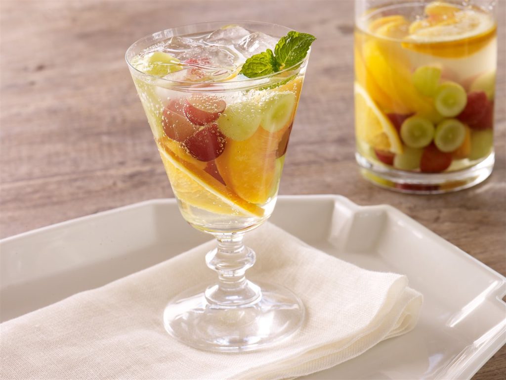 First, set a cool vibe with Grape Sangria Spritzers. California grapes and slices of orange and nectarine sparkle like jewels in a refreshing mixture of rosé wine, brandy or liqueur, and seltzer. Build up the chill by freezing the halved grapes and fruit slices ahead of time. Make this kid-friendly by using flavored sparkling water in place of the wine and brandy.