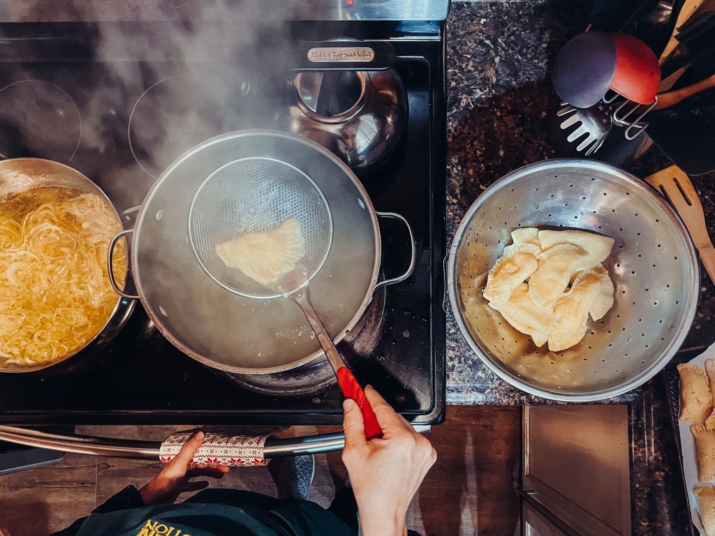 Then, my mom dropped the pierogies into a pot of boiling water and carefully removed them with a slotted spoon when they floated to the top.