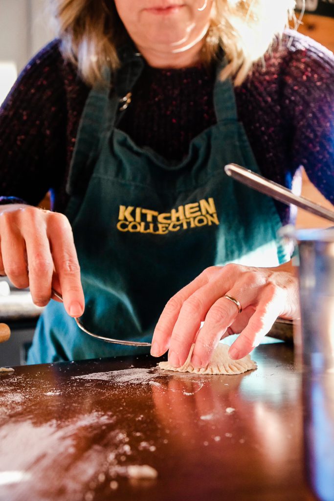 My sister and I were participants in the next part of the pierogie assembly line. While one of us dropped a dollop of the mashed potatoes and cheese mixture onto the circles of dough, the other folded the pierogies in half and sealed them meticulously using the tines of a fork.