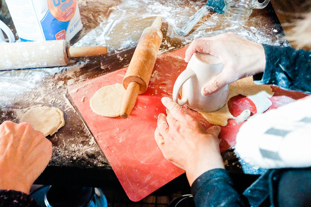 She rolled out the dough and cut out the circles using a drinking glass or coffee mug.