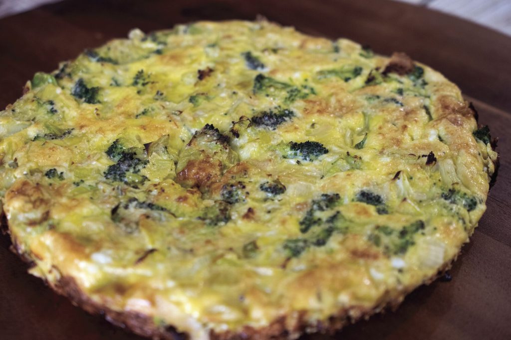 In mixing bowl, mix roasted garlic, sauteed leeks and broccoli, eggs, parsley, Parmigiano Reggiano and cream; place in 9-inch pie dish and bake approximately 20 minutes until top of frittata is brown. Remove from oven and let cool slightly before cutting and serving.