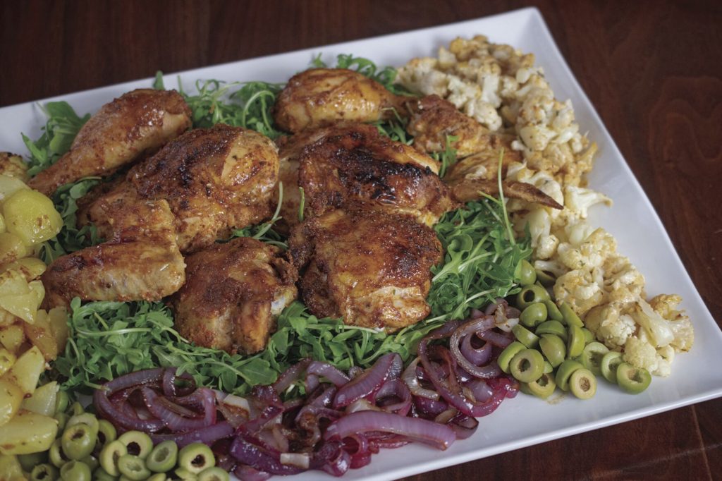 When chicken is crispy and reaches internal temperature of 165 F, remove from oven and add onions and olives. Plate chicken, potatoes, onions, olives and cauliflower on top of arugula and garnish with lemon.