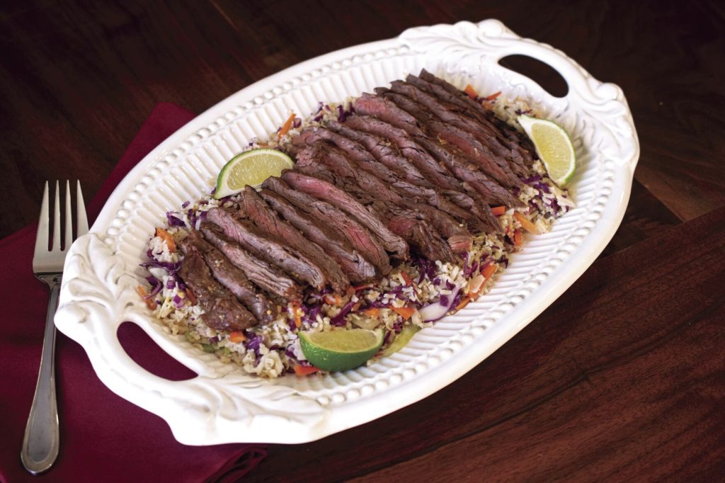 Thinly slice steaks against grain and serve with vinaigrette, rice and crushed peanuts; garnish with lime wedges.