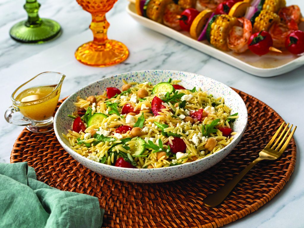 If hot weather means lighter fare is on the menu, this Mediterranean Orzo Salad can be ready in mere minutes. Just toss together a handful of tantalizing ingredients for a simple bite of summer thatÃs perfect as a meatless meal or al fresco side dish. Or you can turn it into a quick weeknight dinner by adding cooked chicken, shrimp or a protein of your choice.
