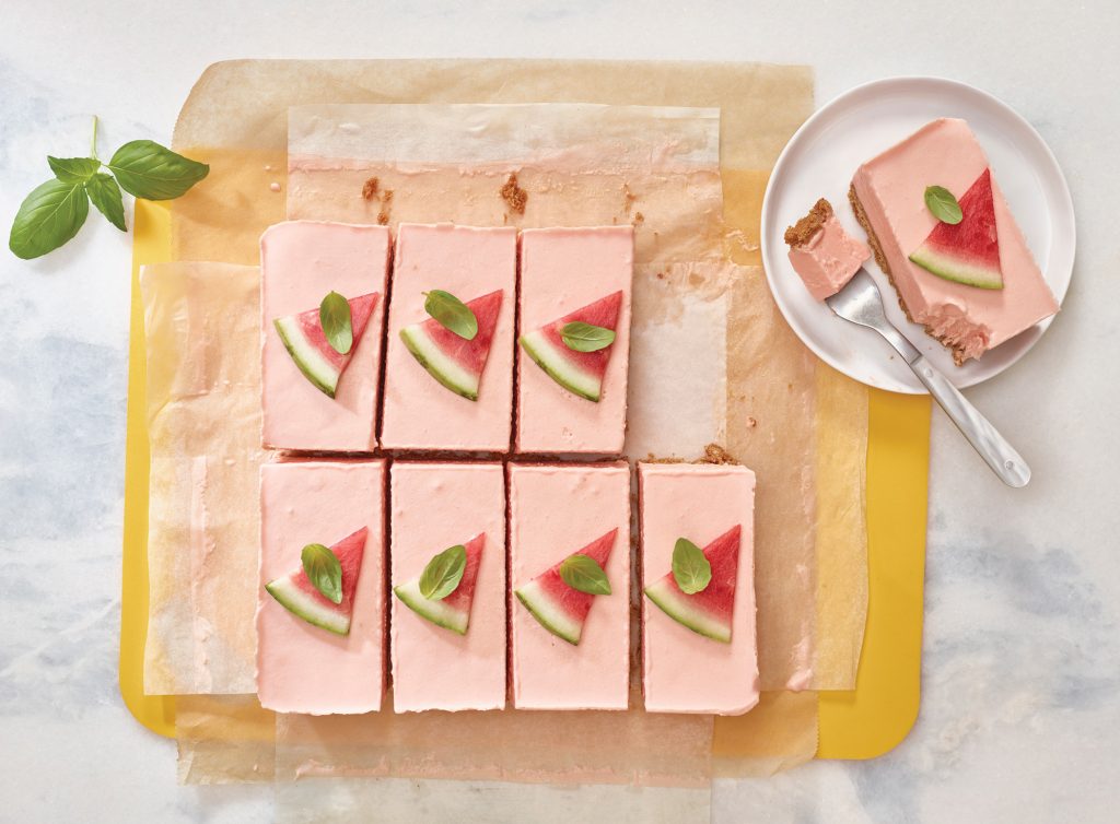 Pour creamy watermelon mixture over graham cracker crust. Freeze dessert completely, 4-6 hours or overnight. When ready to serve, loosen sides with small spatula or butter knife. Turn out onto cutting board and use large spatula to flip so graham cracker crust is on bottom. Cut into eight bars and top each with basil leaf.