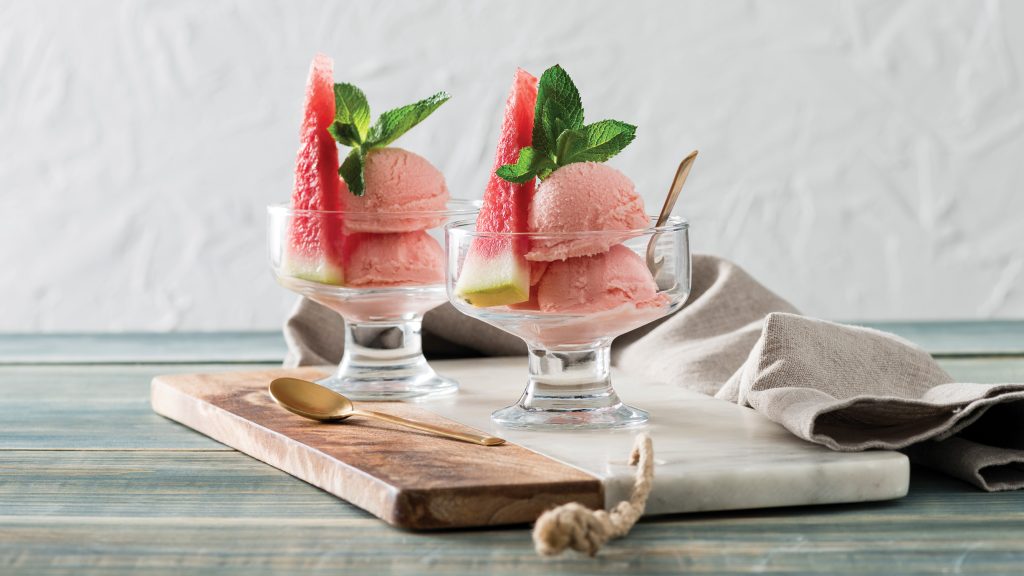 For a lighter, better-for-you solution, this Watermelon Gelato has about half the fat and fewer calories than traditional ice cream but with equally mouthwatering flavor. In fact, the word “gelato” means “ice cream” in Italian, and while the two frozen desserts have much in common, gelato is typically lower in fat with more density.
