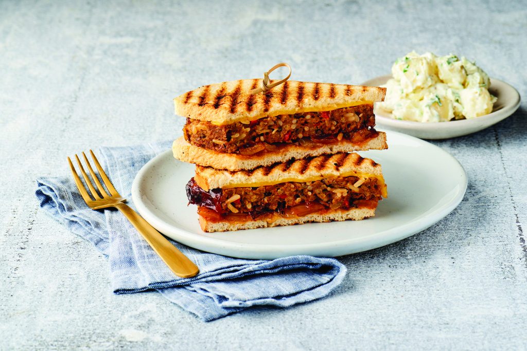 Slice meatloaf into six pieces and place each piece on bread. Top each meatloaf slice with vegan cheddar cheese and sauteed onions then close sandwiches with top bread slices. Using panini press, griddle or frying pan, cook sandwiches until golden brown and cheese is melted.