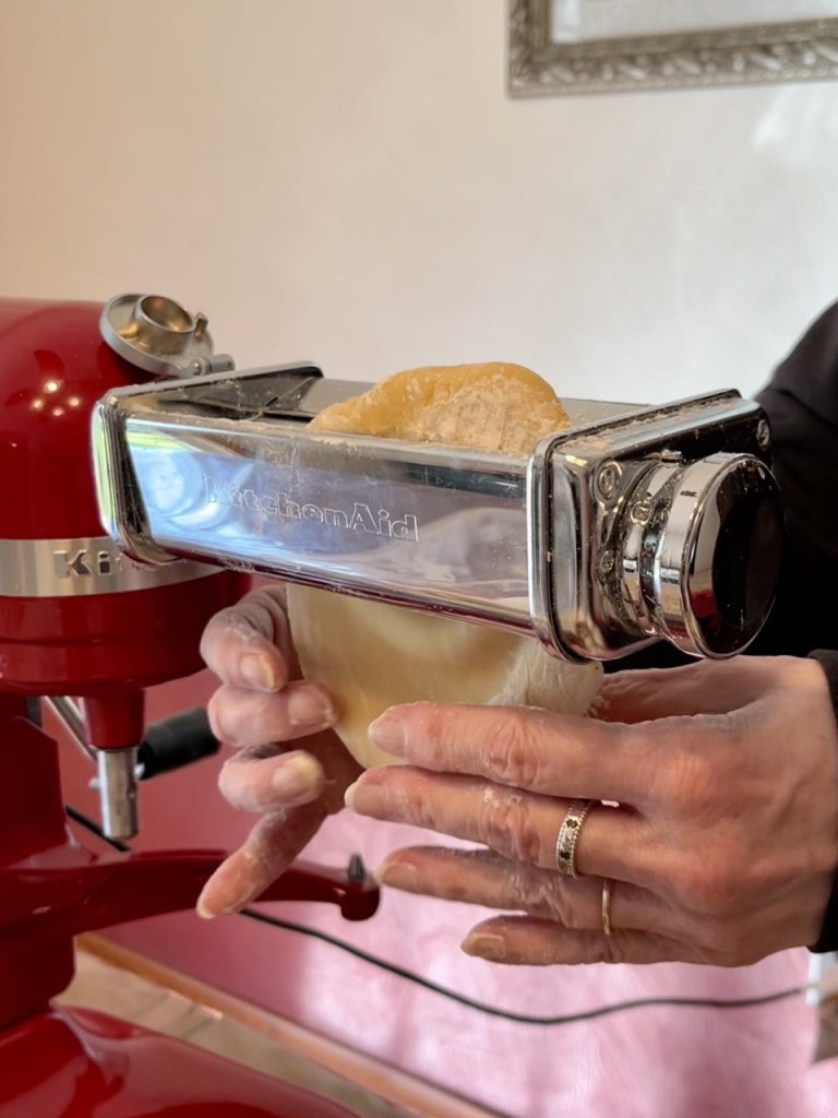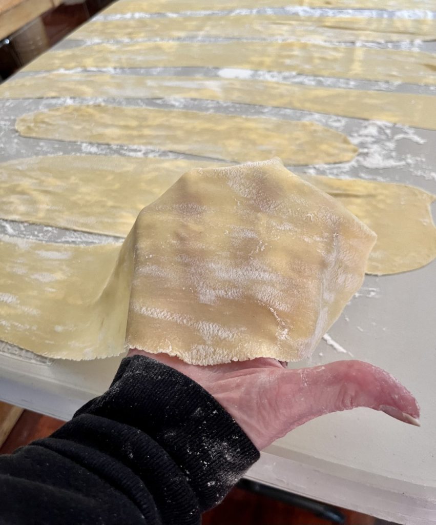 My dad gets up early to prepare roasters of sauce, and then gets to watch football. The rest of us start by feeding dough through a pasta roller until the noodles are long and thin enough.