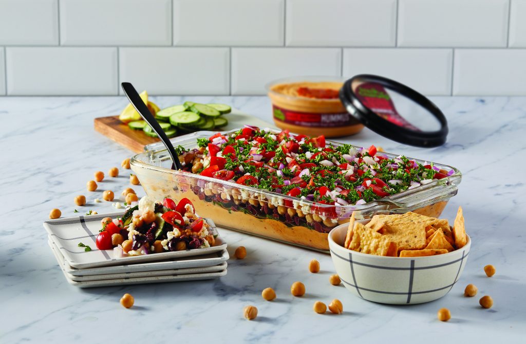 To round out the playbook, this Layered Mediterranean Hummus Salad can make for an accompaniment to a variety of main courses. The cucumbers, olives, cherry tomatoes and other veggies are balanced by the savory taste of Fresh Cravings Hummus. Made with a short list of high-quality ingredients like chickpeas, tahini and Chilean extra-virgin olive oil, it has a smooth, creamy mouthfeel.
