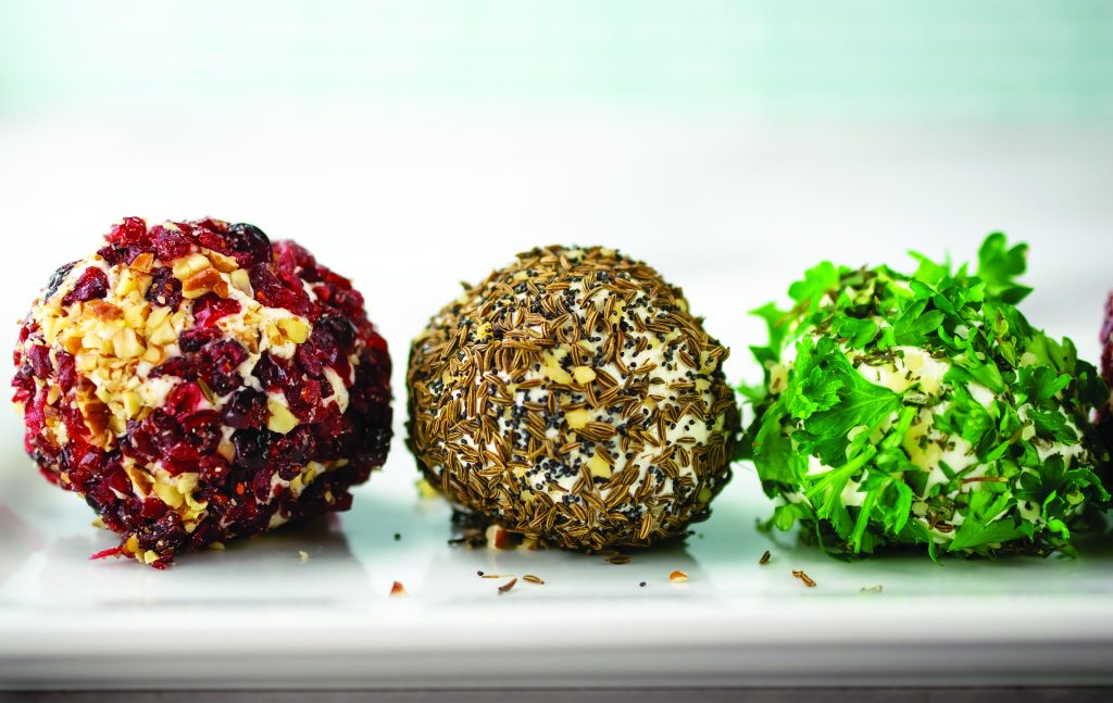 Roll two cheese balls in seed mixture, two in herb mixture and two in cranberry mixture.