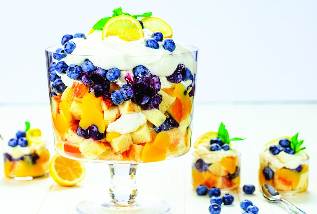 Decorate trifle with lemon slices, fresh blueberries and mint.