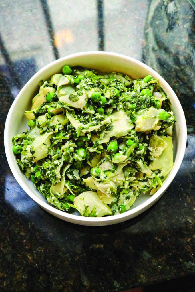 Add spinach, frozen sweet peas, heavy whipping cream, Greek yogurt and Parmesan cheese. Mix until cheese is melted, and peas are soft.