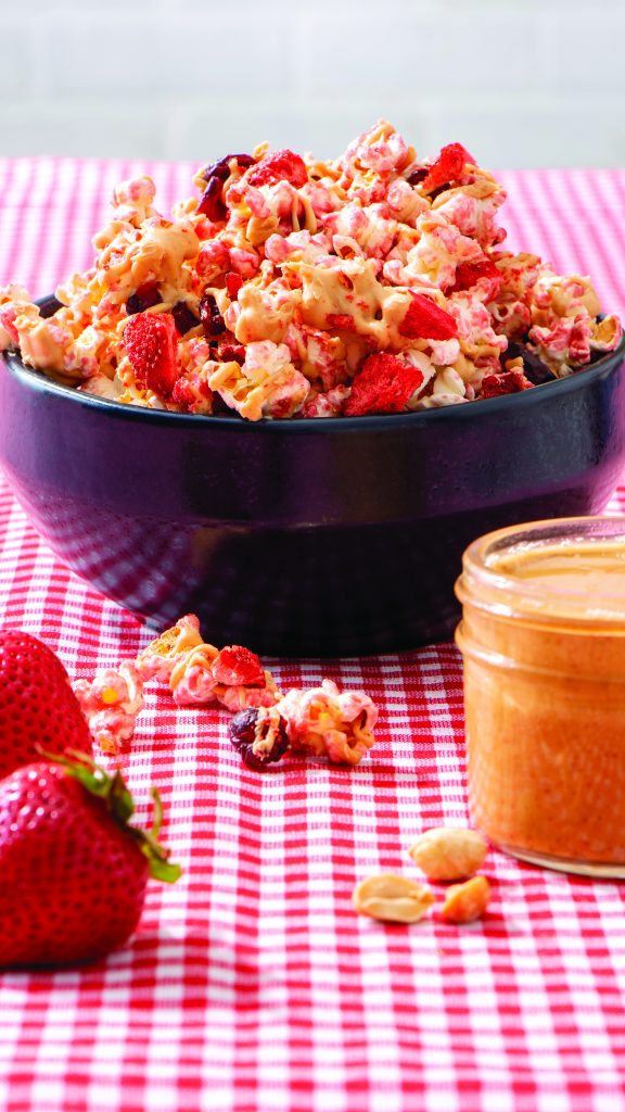 * Take yourself back in time to your own childhood with a classic pairing that never goes out of style: Peanut Butter and Jelly Popcorn. This version offers a fun way to jazz up popcorn for kids and adults alike with a sprinkling of strawberries and dried cranberries on top for added nutrition.