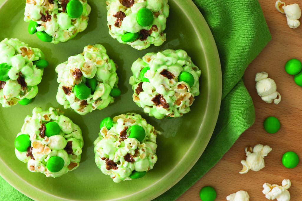 * Colorful and fun, these Minty Green Popcorn Clusters are simple to make and a perfect treat to share. Just melt together marshmallows, butter, salt, green food coloring and peppermint extract before tossing with popcorn and green candy-coated chocolates.