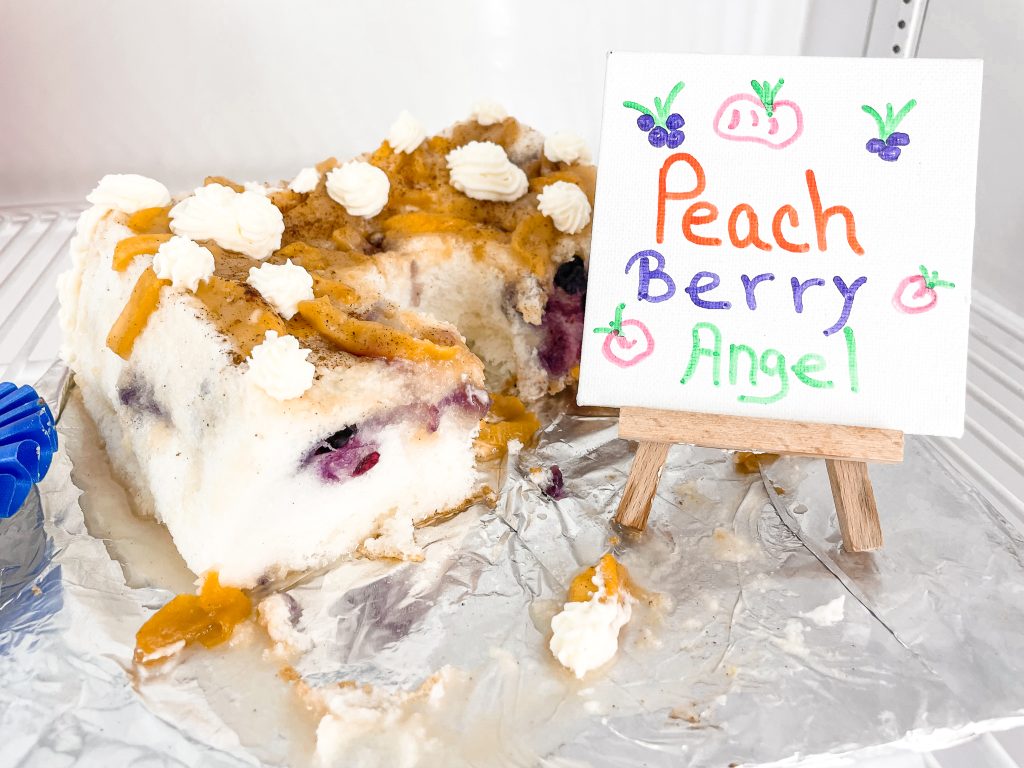 Remove from oven and invert on a bottle for two hours. Loosen edges and remove from pan. Top with peach topping and garnish, if desired, with whipped topping.