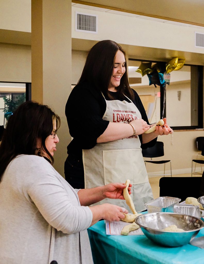 The birthday girl led a discussion on gratitude – “have an attitude of gratitude,” she encouraged – while waiting for the challah dough to rise. Before braiding the challah which, when baked, is as pretty as it is delicious, the ladies gathered in the Chabad kitchen, where Rosenblum broke off a small piece of the batch, comprised of each individualĢƵ dough, and prayed.
