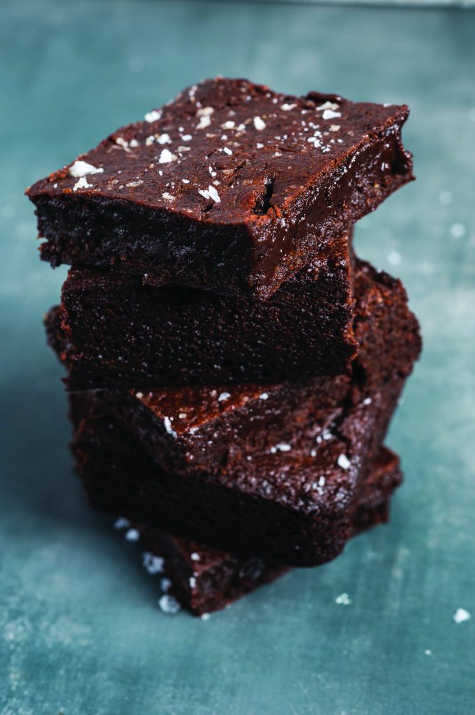 Spread batter in prepared pan, sprinkle with flaky sea salt and bake 20-25 minutes, or until top starts to look dry and brownies are just beginning to pull away from sides of pan.