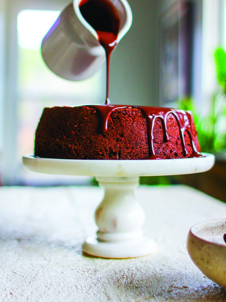 To make ganache: In top of double boiler, melt coconut milk and dark chocolate until completely smooth. Pour prepared ganache over cake. Serve immediately for molten fudge effect or allow to completely set.