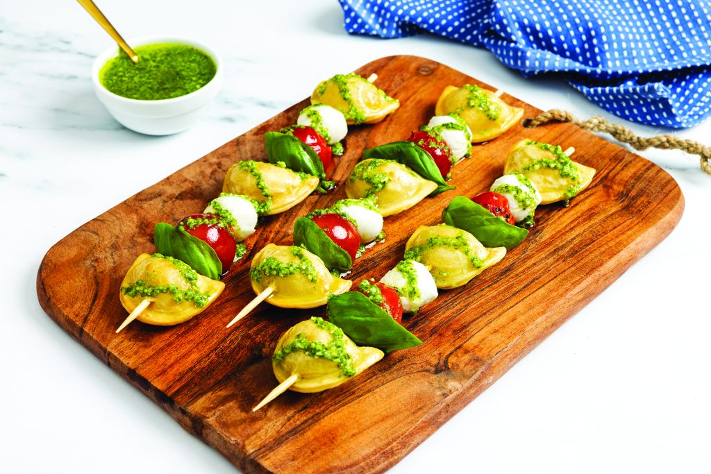 Add one pierogy to bamboo skewer followed by one tomato, one mozzarella ball and one basil leaf. Repeat with ingredients until each skewer is filled. Drizzle with pesto.