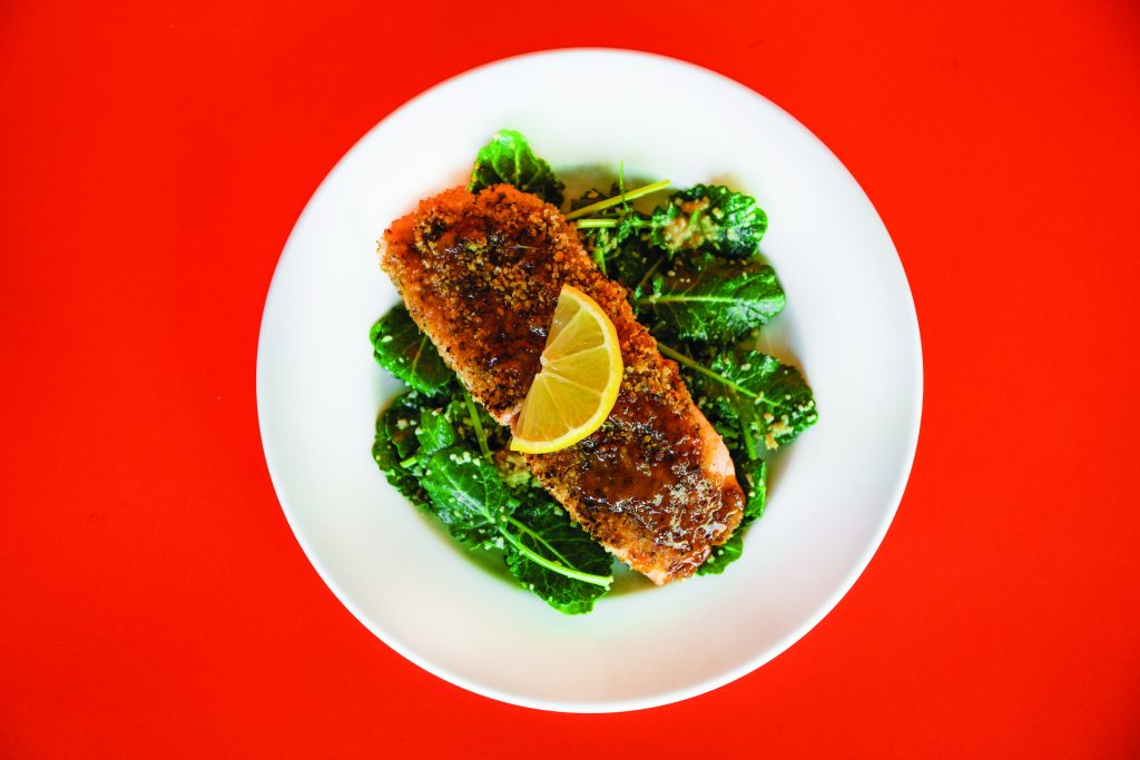Top each salmon portion with 1 tablespoon glaze and spread evenly over fish. Press crunch evenly onto glaze.