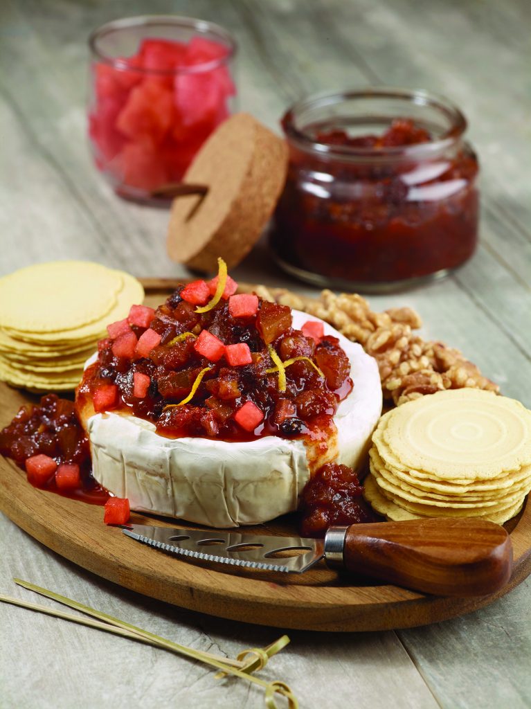 The rind is often thrown out – many people don’t realize you can eat it, too. The rind absorbs flavors added to it and adds an unexpected texture to this Watermelon Walnut Currant Chutney. Try serving over brie with crackers or simply dip with naan or baguettes.